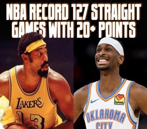 亞歷山大用連續(xù)127場比賽砍下20+詮釋了他的堅韌和穩(wěn)健。更加難得的是,在這127場比賽中,亞歷山大幫助雷霆打出了103勝24負的驕人戰(zhàn)績,勝率達到驚人的81.1%。相比之下,當年的張伯倫在連續(xù)126場砍下20+期間,他所在的球隊戰(zhàn)績是66勝60負,勝率為52.4%。