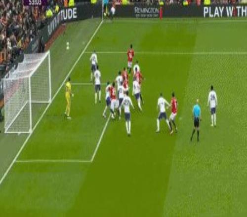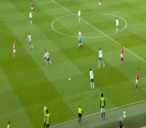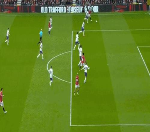 第38分鐘,曼聯(lián)球員B費(fèi)禁區(qū)前沿過(guò)頂長(zhǎng)傳,達(dá)洛特右路插上,停球之后起腳勁射,皮球高出橫梁。