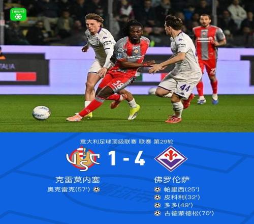 北京時間3月17日意大利足球甲級聯(lián)賽第29輪,克雷莫內(nèi)塞主場迎戰(zhàn)佛羅倫薩。比賽中,佛羅倫薩率先憑借一次助攻由帕里西打入一球,隨后又通過兩次助攻分別由皮科利、多多接連破門;克雷莫內(nèi)塞則依靠一次助攻由奧克雷克扳回一球,但佛羅倫薩此后再通過一次助攻由古德蒙德松完成破門。最終比分定格為克雷莫內(nèi)塞1-4佛羅倫薩。
