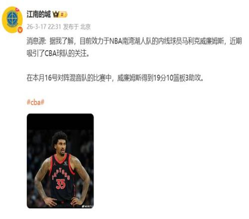在廣東和新疆的比賽結束后,和外援經紀公司有合作的媒體人“江南的城”爆出了一條猛料:目前效力于NBA南灣湖人隊的內線球員馬利克威廉姆斯,近期吸引了CBA球隊的關注。