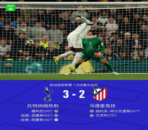 北京時間3月19日歐洲冠軍聯賽 1/8決賽次回合,托特納姆熱刺對陣馬德里競技。托特納姆熱刺穆阿尼破門,哈維-西蒙斯梅開二度。馬德里競技胡利安-阿爾瓦雷斯破門,漢茨科破門。最終比分熱刺 3-2 馬競。兩回合總比分熱刺5-7馬競。