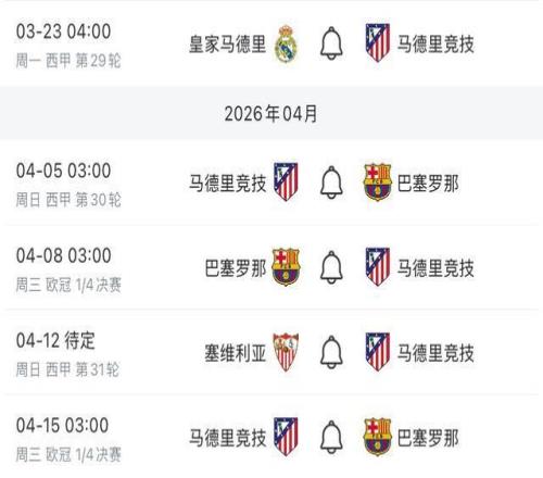 根據(jù)安排,馬競(jìng)即將迎來(lái)一段魔鬼賽程,本周末他們將在西甲第29輪的馬德里德比中做客挑戰(zhàn)同城死敵皇馬。國(guó)際比賽日過(guò)后,馬競(jìng)將首先在西甲第30輪的比賽中坐鎮(zhèn)主場(chǎng)對(duì)陣巴薩,那場(chǎng)比賽三天后他們又會(huì)迎來(lái)歐冠1/4決賽首回合客場(chǎng)與巴薩的比賽。一周之后,他們與巴薩的次回合比賽還將移師大都會(huì)球場(chǎng)進(jìn)行,而在歐冠與巴薩的兩回合比賽之間,他們還有一場(chǎng)客場(chǎng)與塞維利亞的西甲第31輪比賽需要進(jìn)行準(zhǔn)備。