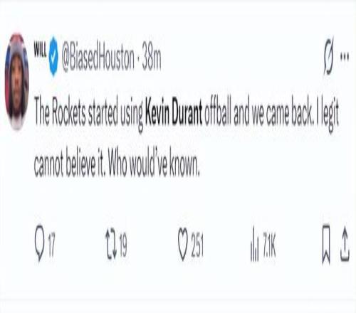 火箭記者Bradeaux已經(jīng)忍無可忍了,他寫道:我要把現(xiàn)在的困境完全歸結(jié)于烏度卡,這就跟上一場一模一樣,他把隊(duì)員們置于失敗的境地,我再也不想看到杜蘭特運(yùn)球到前場了,這簡直不可原諒。