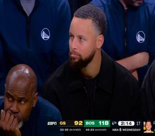 接著是比賽末節(jié)失去懸念時,現(xiàn)場導播第一時間將鏡頭切向坐在場邊替補席的庫里,后者撇嘴看起來很不開心。