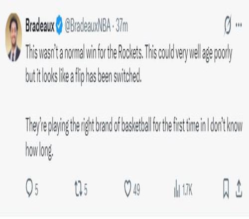 休媒:對于火箭來說這場比賽絕非一場普通勝利,這場比賽看起來全隊的態(tài)度都已經發(fā)生轉變,他們終于開始打真正高水平的籃球,我已經記不得他們上一次打出這樣的籃球是什么時候。(這就是第七喜:掃除了外界的流言,說KD與申京不合,隊內有人已經開始不滿交易得到杜蘭特)