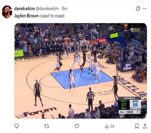 第二節(jié)布朗搶下后場籃板后一條龍各種閃轉(zhuǎn)騰挪上籃命中,單節(jié)6中3+三分3中2拿到10分2籃板2助攻,半場布朗16分4籃板2助攻1搶斷,而塔圖姆半場10中1+三分7中1鐵出天際。