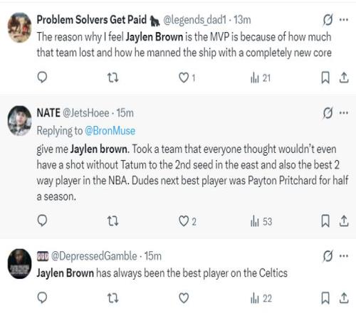 綠凱球迷:1.我之所以認為布朗才是MVP,是因為這支球隊遭遇了重大打擊,布朗帶著全新的陣容依舊是東部勁旅;