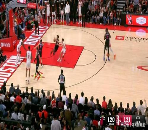 在比賽僅剩12.7秒,且24秒進(jìn)攻時(shí)間即將耗盡的絕境之下,謝潑德命中一記壓哨拋投,為火箭隊(duì)贏得3分領(lǐng)先。熱火隊(duì)隨后發(fā)起進(jìn)攻,阿德巴約兩罰全中,將分差縮小至1分。此時(shí),火箭隊(duì)底線發(fā)球遭遇難題,并出現(xiàn)了全場(chǎng)最為低級(jí)的失誤。