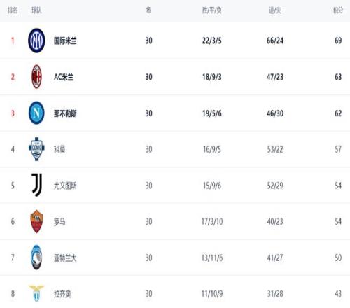 在積分榜上,國(guó)際米蘭依然占據(jù)榜首位置,戰(zhàn)績(jī)是22勝3平5負(fù),拿到69分,排名第1。第2名的AC米蘭只拿到63分,落后6分,爭(zhēng)冠希望不大。那不勒斯緊隨其后,拿到62分。第4名是大黑馬科莫,拿到57分。尤文圖斯只拿到54分,排名第5。羅馬贏球之后,也是54分,排名第6。亞特蘭的以50分排名第7。拉齊奧只拿到43分,排名第8。