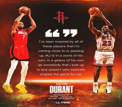 杜蘭特在采訪中談到自己打破喬丹的得分紀(jì)錄,他表示:無(wú)論誰(shuí)超過(guò)喬丹的數(shù)據(jù),可MJ的影響力不可撼動(dòng)。MJ不是得分榜第一可他影響力太大了,他的每一項(xiàng)都是歷史性的,能在得分上接近他已經(jīng)是一種榮譽(yù)。